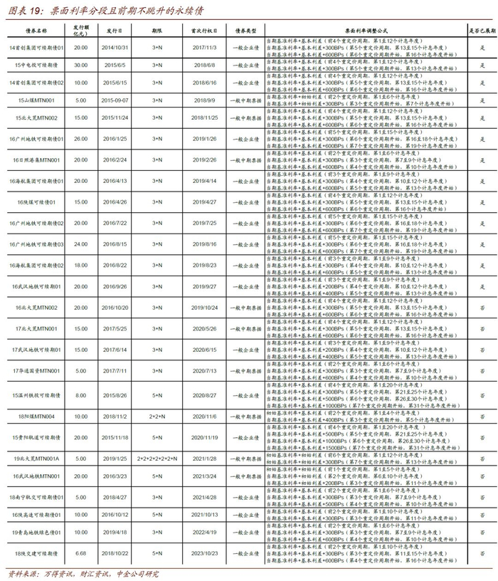 我们筛查出票面利率分段且前期不跳升的永续债共26支,发行金额合计392.68亿元(图表19)。从债券类型来看,有17支为企业债,其余9支为中票。从票面利率的条款来看,普遍划分为2-4个阶段,最长可以在前20个计息年度内不进行跳升。这26支债券中,行权日靠前的13支债券已全部公告选择展期。当然这并不意味着凡是票面利率分段且前期不跳升的债券均一定会选择展期,而是我们的筛查仅以存续债券为样本,那些未选择展期的债券兑付完成后已不再存续。除了前述13支已展期债券外,后续看年内还有16北大荒MTN002将面临行权,提醒投资者关注。