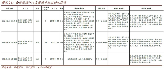 (3)计入负债而非权益的理由:根据募集说明书关于会计处理部分的明确阐释,上述10支债券计入负债而非权益的理由主要包括:①不设利息递延支付条款,即发行人不能选择在每个利息支付日将全部或部分当期利息和已经递延的利息及其孳息推迟至下一付息日,如15温州铁投可续期债、15贵阳轨道可续期债、17桂铁投MTN001。②含投资者回售选择权,如18涪陵Y1、19涪陵Y1、19晋建Y2。在加入了回售选择权后,实质上可理解为允许多次行权的可回售债,与普通可回售含权债的区别在于没有明确到期日、行权次数无限制。这3支债券在募集说明书中均赋予发行人调整票面利率选择权。此时发行人需要提前公告是否调整票利率、调整方式(加/减)以及调整幅度。若发行人未行使调整票面利率选择权,则下一个重新定价周期票面利率仍维持原有票面利率不变。如果投资者愿意接受新定价周期的票面利率,可以不断续期。此外,19涪陵Y1和19晋建Y2除了含投资者回售选择权,还不含利息递延支付条款(不过会计处理条款部分明确提及计入负债的理由是投资者回售权),导致债券的股性被进一步弱化。③与会计新规适应:19宜兴环保MTN002在募集说明书中称,经对发行条款和相关信息全面分析判断,在会计初始确认时不计入所有者权益,还专门强调了本次发行符合永续债会计新规的相关规定。结合会计新规来看,该债券计入负债,可能与在破产清算时的清偿顺序等同于发行人其他债务有关。④会计师事务所出具材料:春华水务的3支中票在会计处理部分均称,根据会计师事务所出具的不计入权益的专项说明,债券不计入发行人权益。