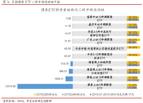 由于缺乏有效的做市机制,二级市场流动性不足是现有债券ETF的一大弊病,从2019年1-8月的成交情况来看,10只债券ETF中,仅国泰旗下2只国债ETF的日均成交额在千万以上,海富通基金旗下的上证10年期地方政府债ETF和上证城投债ETF单日成交额在百万级别,其余债券ETF单日成交不足百万。
