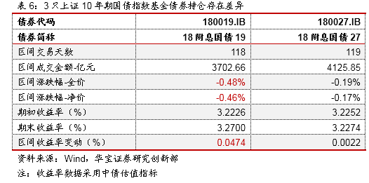 重仓债券差异主要通过公允价值变动项影响指数基金业绩,以银华上证10年期国债A为例,该基金核心券种18附息国债27在2019年上半年收益率和价格波动不大,而国泰上证10年期国债ETF和广发上证10年期国债ETF重仓券种18附息国债19在2019年上半年收益率上行4.74个BP,价格下跌0.48%,导致两只基金2019年上半年公允价值变动为负。