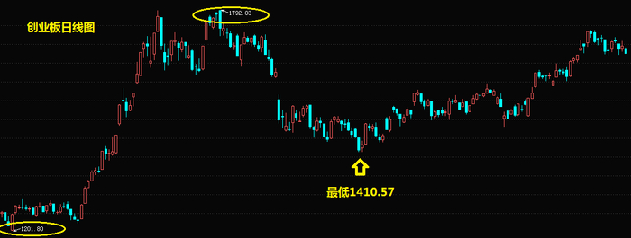 来看一下创业板指数,从年内低点1201.80点到年内高点1792.03点,涨幅590.23点,把590.23×0.618=364.76,再用1792.03-364.76=1427.27,和6月初的最低点1410.57已经很接近了,可以说是相当准确。
