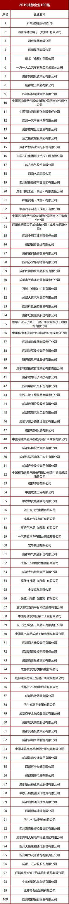 9月26日,成都企业联合会发布了“2019成都企业100强”“2019成都制造业100强”“2019成都民营企业100强”和“2019成都服务业100强”四个百强排行榜。