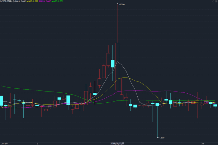 2018年国庆节前的一周。7天期限国债逆回购产品的收益率,9月25日之后开始一路飙升,从3.5%起步到节前最后一天一度达到6%。9月27日、28日的1天期逆回购收益率盘中最高分别到达4.6%、6%。而在2017年的“十一”长假前,9月28日、29日1天期逆回购收益率更是最高飙涨到14.5%、23%。