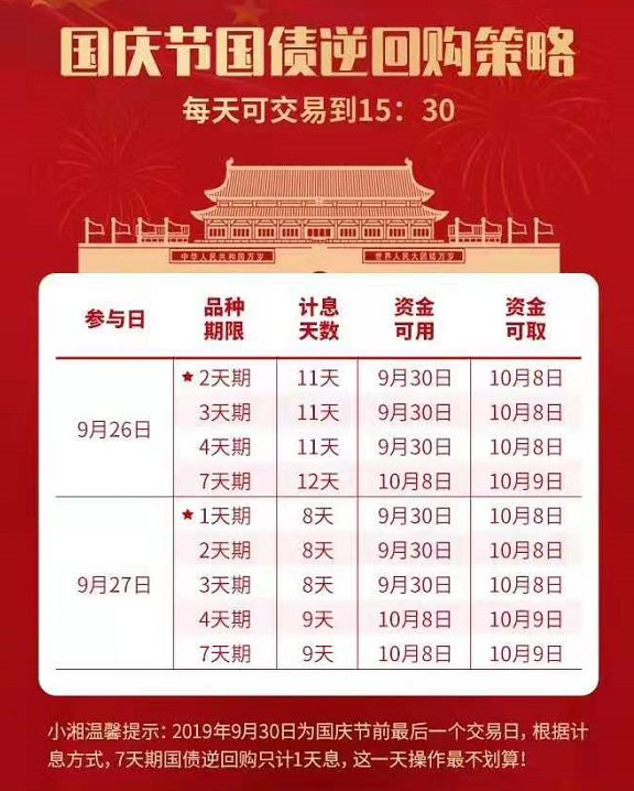 9月26日,操作2天期、3天期和4天期国债逆回购,可计息11天,9月30日资金可用,10月8日资金可取;