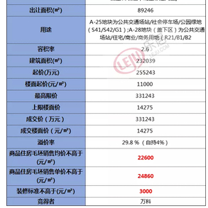 根据新房限价条件,地块所建商品住房毛坯销售均价不得高于22600元/平方米,如实施装修销售的,装修价格不高于3000元/平方米。