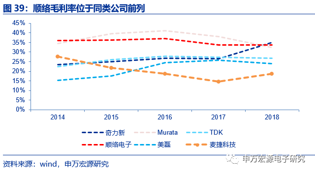 顺络为国内电感领军,技术为核心竞争力,全球唯二具01005电感规模量产能力。顺络电子成立于2000年,深耕电感领域近20年。持续稳步高质量成长,2009-2018年营收CAGR达21.9%,净利润CAGR达22.9%。现金流与净利润高度匹配,负债率保持低位。顺络于2017年正式实现超小型01005高Q值特性叠层片式射频电感HQ0402H的量产,为全球第二家具备量产能力的企业,紧随村田之后。顺络在部分规格的01005电感Q值特性要优于村田,在高端小型化电感上具备技术竞争力,将充分受益于此轮5G推动的行业发展红利。公司的综合毛利率位于同行前列,历史来看仅次于村田,也从侧面反映产品技术竞争力。同时随着未来高端产品放量带来结构优化,毛利率仍有上行空间。