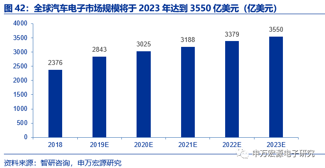 全球汽车电子市场将于2023年达3550亿美元,成长空间广阔。根据智研咨询数据,2016年全球汽车电子规模将达到2348亿美元,预计到2023年将达到3550亿美元。国内汽车电子市场亦呈现出高速稳定增长态势, 预计2019年市场规模达962亿美元。