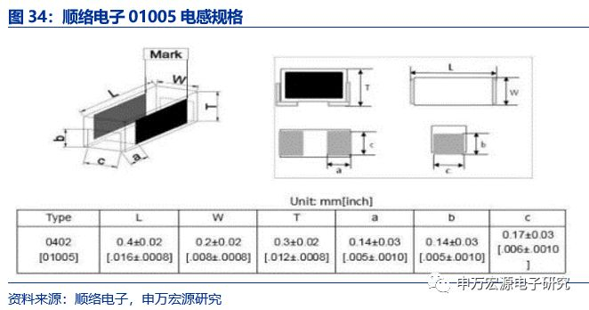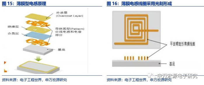 01005型电感与传统叠层电感在工艺上有明显差异,采用了黄光显影,本质为薄膜型电感,技术壁垒显著提升。根据申万电子预计,01005型电感在体积上仅为0201型的约30%。体积大幅缩小的情况下,对于线圈的精细度、一致性要求呈指数级提升。因此01005型电感采用了类似于IC制作的工艺,在基底上镀一层导体膜,然后采用光刻工艺形成线圈,最后增加介质层、绝缘层、电极层,封装成型。此工艺能够使线条更窄、边缘更清晰,容差也更小,频率稳定性高。