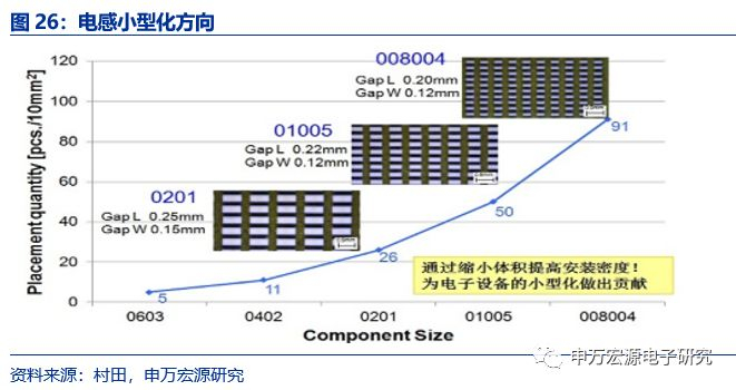 因应射频前端集成化,电感小型化成为趋势。集成化、模块快意味着在同等的空间内需要整合进更多的射频器件,以实现更多的功能。相应的也给电感、电阻、电容等基础元件的精密化、小尺寸化带来更高的要求。如果电感等元件尺寸过大,则无法集成到射频电路中,给射频前端的集成化带来阻碍。因此,小型化电感成为行业趋势。目前主流电感尺寸有英制0201(0.6×0.3mm)、0402(1.0×0.5mm)、0603(1.6×0.8mm)、0805(2.0×1.25/1.5mm)、1206(3.2×1.6mm)等。根据我们预计,当前手机中0201电感为主流,占比约6成左右,正逐步向更小、更先进的01005(0.4x0.2mm)电感导入。
