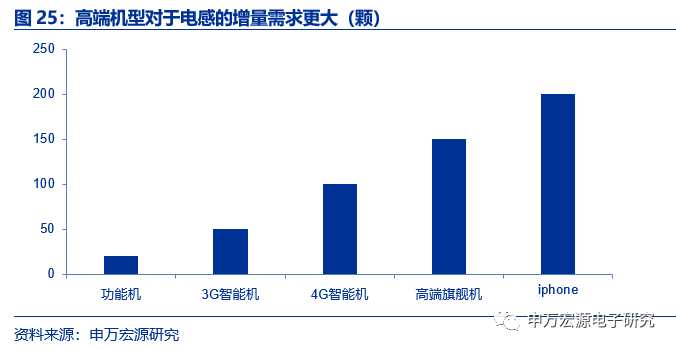 手机单机电感用量快速提升,高端机型增量尤为显著。根据申万电子预计,传统功能手机电感用量仅20颗左右,4G智能机电感用量在100颗左右,高端旗舰机用量达到了150颗,而iphone单机电感用量已超过200颗。高端机型在射频前端上的复杂度、集成度更高,因此对于电感的增量需求会更大。
