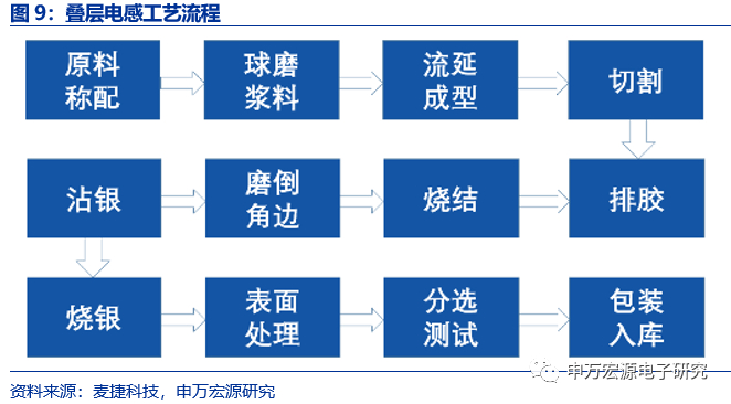 叠层片式电感的制造工艺流程包括原料调配、球磨浆料、流延成型、切割、排胶、烧结、磨边倒角、涂银、烧银、端头处理、测试分选等,其中球磨、流延成型、烧结、和端头处理是影响产品性能和一致性的重要工艺过程,材料配比亦是关键。