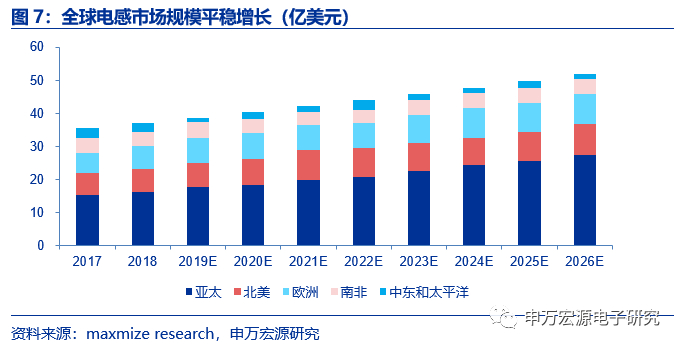 18年全球电感市场规模37亿美元,亚太地区为最大市场。据机构maxmize research数据,预计未来电感市场将保持平稳增长,2026年将达到52亿美元,18-26年CAGR达4.29%。分区域来看,亚太地区为全球最大市场,且成长性最佳,预计2026年份额将超50%,研判主要由中国市场贡献。