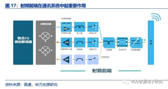 射频前端是指在通讯系统中,天线和基带电路之间的部分。在这一段里信号以射频形式传输。射频前端分为发射通路和接收通路,主要器件包括功率放大器(PA)、滤波器、低噪声放大器(LNA)、射频开关、双工器和其他被动元件等。射频前端对手机信号的收发起到重要作用,其设计复杂度与支持频段数高度正向相关。
