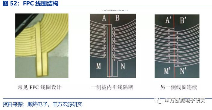 接收端线圈方案,FPC有较大瓶颈。发射线圈技术的差异不是很大,但接收线圈会受到产品空间的限制,而需要控制发热等问题,因此对接收线圈的技术要求较高。目前无线充电接收端常见线圈有FPC线圈和多股绕线线圈,以FPC为主。FPC在结构上采用双层结构,上下层通过通孔进行连接,内引线需要跨越其中一面的线圈得以引出到线圈外围。此类线圈比较容易实现厚度的一致性,整体厚度也就是双层FPC的厚度。但也有较为明显的缺陷: