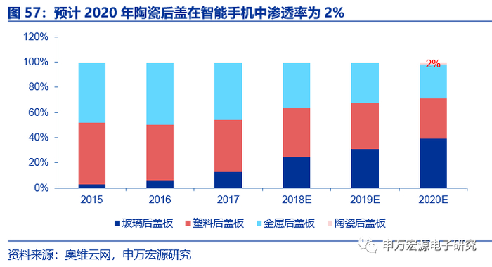 5G时代手机后盖材料将主要使用塑料、玻璃和陶瓷。由于金属材质导致窄边框产品天线净空区设计难度增加、屏蔽无线充电的电磁波、影响5G信号传输等方面的弊端,随着全面屏、无线充电、5G等在智能手机上应用普及,未来中高端手机后盖的选择势必非金属材质。其中塑料外观和手感最差,成本也最低,将成为低端手机的首选。陶瓷与玻璃相比,手感和外观更显高档,散热性和硬度也较好,在高端机型的渗透率有望大幅提升。根据奥维云网的预测,到2020年,陶瓷后盖板在智能手机中的渗透率约为2%,预计到2023年,陶瓷后盖市场在150亿-300亿的规模。