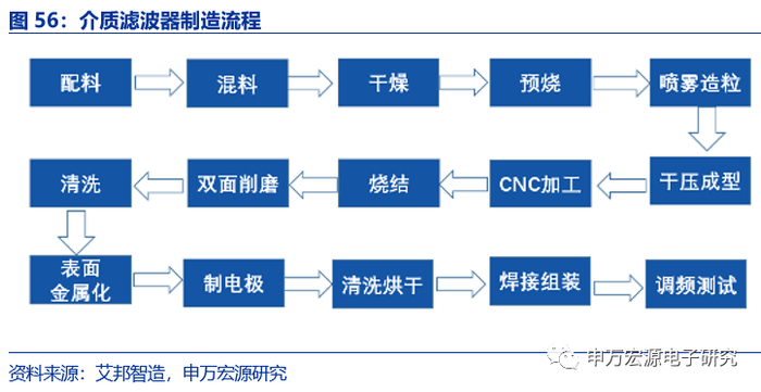 顺络已完成产品研发,材料配方能力为核心优势。由于该产品为5G需求引致的新产品,厂商在研发及制造环节均面临竞争。介质滤波器产品工艺流程难点在于配料、粉末成型、金属化和研磨组装四大环节:在配料阶段,企业需要持续研发获得高介电常数陶瓷粉料;成型烧结工艺将粉料压成特殊机械尺寸的陶瓷块,经过1000度以上高温烧结,得到高Q值、低温度系数的介质基体;对烧结后基体进行金属化处理,烧银后获得固状导电银层;在研磨环节,完成尺寸研磨、参数调试,最后进行激光、组装等辅助工序。顺络基于自身多年积累的陶瓷工艺,配方能力,在核心工艺上具有丰富的技术储备。传统金属腔体滤波器厂商的优势在于其已在客户供应链多年,具有一定的先发优势,以及更丰富的行业经验。但我们认为,在外部环境的影响下,国内客户对于核心器件的国产化将是不可逆的趋势,随着5G基站建设于未来1-2年将进入高峰期,产品具有技术竞争力的企业将受益于订单的外溢效应。