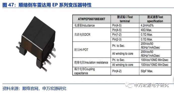 针对倒车雷达解决方案的变压器是目前公司的关键突破产品。超声波雷达是汽车的基础功能之一,同时随着ADAS系统的逐步导入,汽车配备的超声波雷达数量也将迅速提升。针对超声波探头的驱动部分,顺络电子的EP变压器系列采用全自动化生产流程,具有高度一致性和可靠性,温度可满足245℃/ 10S,满足AEC-Q200 Grade 1认证,阻抗匹配特性优异。目前已陆续获得博世等客户认证,预计将逐步进入订单放量与交货阶段。