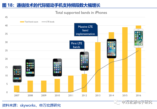 通讯技术的代际驱动手机支持频段数大幅增长,5G手机频段数将翻倍。历代iphone手机支持频段数逐年提升,尤其在由3G向4G切换当年,在支持频段上有显著增量。根据射频器件巨头skyworks预测,到2020年,5G手机支持的频段数量将实现翻番,新增50个以上通信频段,考虑向下兼容性,5G手机合计支持的频段将达到91个以上。