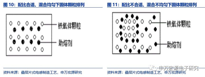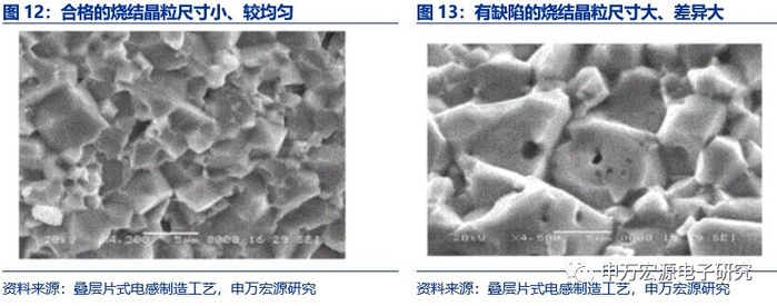 3)烧结工艺:其是指在850-900度的高温下在氧化气氛下降铁氧体和导体线圈工烧成一个整体的过程。对于烧结温度、烧结时间、升温降温速度有严格的要求。升温速度过快将导致磁体缺陷较多;温度过高会导致晶粒生长过大,导致气孔过多;降温速度过快会导致缺陷来不及从磁体内溢出而被晶体包裹。烧结对于产品电气性能起到决定性因素、是产品可靠性的关键。