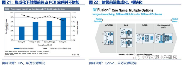 射频前端数量提升和PCB可用面积趋紧之间的矛盾,倒逼射频前端集成化、模块化发展。智能手机的轻薄化趋势不断演进,直接导致射频前端的物理空间减少。另一方面,考虑到大尺寸屏幕对电池续航的影响,射频前端的设计更要重视电源使用效率。然而射频器件数量的大幅增加,必定带来占用空间的提升,而手机内部PCB可用空间十分有限,因此模块化、集成化成为发展趋势。射频前端需要集成更多的部件,互相之间形成模组。以三星手机为例,其内部射频器件集成度逐代提升,占PCB板面积却并无明显增加,甚至出现小幅下降。可见集成化、模块化对于手机内部空间节省成效显著。