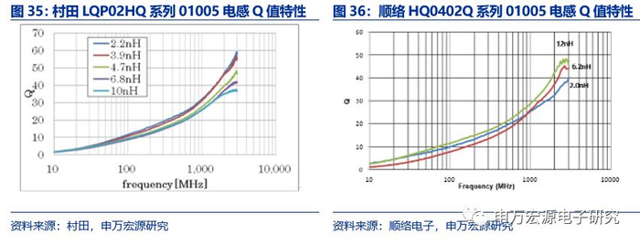 高端产品同村田在性能上差距不大,部分型号甚至优于村田同类产品,技术实力得到充分验证。Q值是衡量电感器件的主要参数。是指电感在某一频率的交流电压下工作时,所呈现的感抗与其等效损耗电阻之比。Q值越高,损耗越小,效率越高。在小型化的同时,要保证电感的高Q值是十分关键的技术难点。从村田LQP02HQ系列01005电感与顺络HQ0402Q系列对比来看,顺络在部分规格的电感Q值特性要优于村田,综合来看差距并不大。顺络在高端小型化电感上具备技术竞争力。