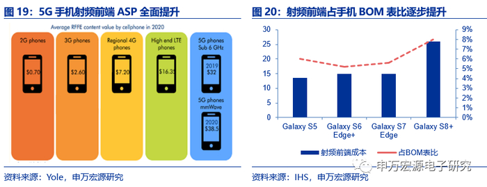 射频器件用量与单机价值将全面提升。频段的增加通常需要相应提升滤波器、天线开关、PA等射频前端器件的用量,以支持信号在该频段的发射与接收。不同器件数量增幅不同。例如,滤波器用量跟频段数线性相关,一个频段对应至少1-2个以上的滤波器。而部分器件如PA等一定程度上可以通过电路的设计实现复用,因此增长相对非线性。整体来看,5G手机的射频器件用量将大幅提升,相应的射频前端价值量也将出现翻倍的增长。