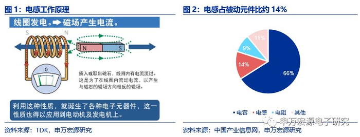 电感为第二大被动元件,占比约14%,主要用于电源转换、滤波和信号处理。电感与电容和电阻同为电子电路的基本组成部件,也被称作线圈。其工作原理是导线内通过交流电时,在导线的内部及周围产生交变磁通。电感主要用途可以分为信号型与电源型两种。信号型电感器又称射频电感器,尤指在射频电路等中使用,主要频率匹配或作为滤波器使用。电源型电感器则用于向半导体供给电源的电路中,起到静噪和平滑等作用。