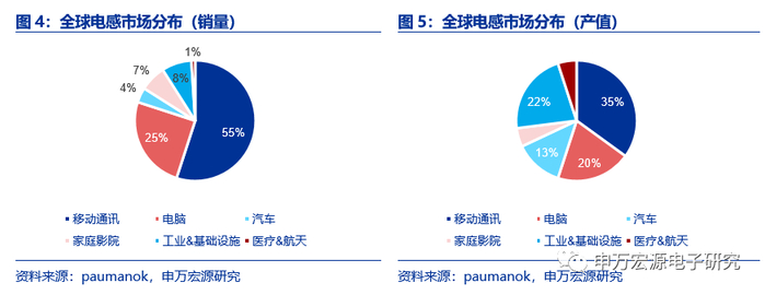 移动通讯是电感最大下游市场,医疗航空、汽车、工业用电感价值量高。从电感用量分布来看,手机等移动通讯领域对于电感的需求量占比高达55%,产值占比35%。从价值量来看,医疗航空领域的电感平均售价是移动通讯领域的6-7倍,高端产品具有极高的附加值。汽车、工业用电感亦属于高端产品,价值量均为移动通讯领域的数倍。