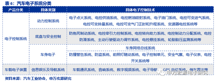 汽车电子主要分为四大类:动力控制系统、安全控制系统、通信娱乐系统和车身电子系统。汽车电子最重要的作用是提高汽车的安全性、舒适性、经济性和娱乐性,是用传感器、微处理器MPU、执行器、各类电子元器件及其零部件组成的电控系统。
