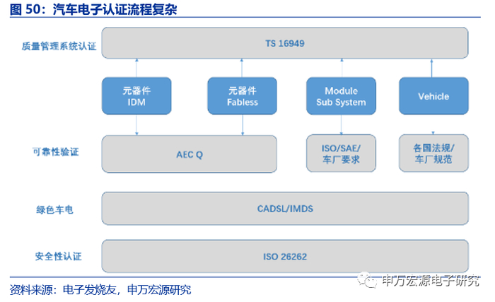严苛要求体现于复杂认证流程与长认证周期。要进入汽车领域,切入各Tier1汽车电子大厂供应链,首先必须取得两大权威认证。第一是由北美汽车产业所推的AEC-Q100(IC)、AEC-Q101(离散元件)、AEC-Q200(被动零件)可靠度标准;第二则是要符合零失效(Zero Defect)的供应链品质管理标准ISO/TS 16949规范。只有通过国际相关质量管理体系认证的零部件企业才能进入整车配套体系,具备供应商基本资格。整个认证程序庞杂,认证周期长。一般从意向到批量供货需要10余项认证流程,认证周期一般最短需18个月,通常需要长达5年的时间。即使通过认证,到获得订单也需要等待新品产业链的机会。