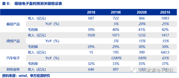 3)汽车电子业务:电子变压器已开始放量,随着后续切入更多增量客户以及更多新品类的导入,将迎来爆发式增长,预计19/20/21年收入增速为1200%,100%,65%。