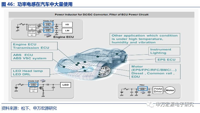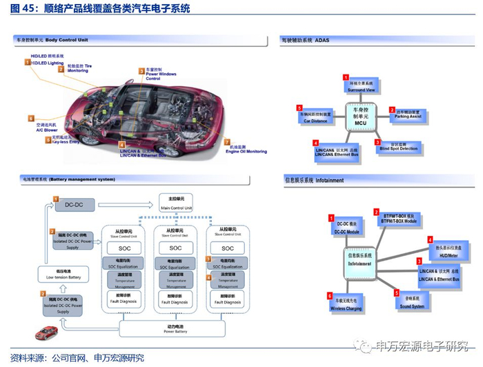 公司积极进行汽车电子布局,产品现已覆盖汽车电子主要系统,包括汽车多媒体和无线连接系统,车身与舒适系统,底盘和安全系统,并未进入动力总成系统。产品类别包括EMC元件(共模扼流器)、电感(高频电感、PoC电感、绕线贴片功率电感)、变压器(绕线变压器、平面变压器、脉冲变压器)、无线充电线圈。从功能上来看,共模扼流器主要用于EMI抑制;电感用于电路滤波或扼流;二合一电感专门应用于音响功放;变压器用于超声波倒车辅助和BMS;无线线圈用于防盗系统和进入系统。