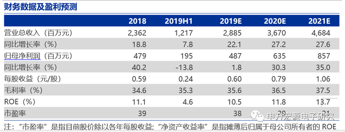3)汽车电子业务:目前公司的电子变压器已开始放量供应,随着后续切入更多增量客户以及更多新品类的导入,将迎来爆发式增长,预计19/20/21年收入增速为1200%,100%,65%。