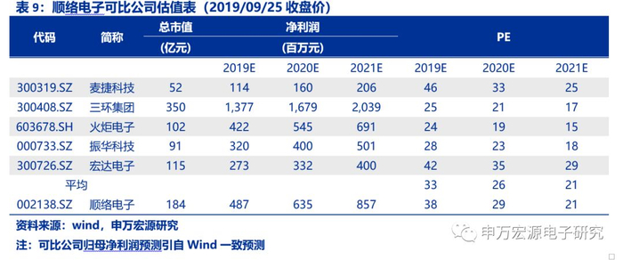 调整盈利预测,维持“增持“评级。基于以上假设,预测公司19/20/21年营业收入分别为28.9/36.7/46.8亿元,预测19/20/21年归母净利润分别为4.87/6.35/8.57亿元。选取被动元件企业麦捷科技、三环集团、火炬电子、宏达电子、振华科技作为可比公司。可比公司2019年平均PE为33倍。考虑到顺络为全球唯二具备01005型电感量产能力企业,在全球竞争力层面要优于大部分可比公司。同时叠层电感为射频电路必备元件,将充分受益于5G带来的红利,其未来的业绩更具有弹性。公司众多新产品已开始步入放量收获阶段,汽车电子业务的高认证壁垒、长周期订单属性将保障公司有持续稳定的第二增长点。2019年实际为业绩低谷期,2020年起将重回高增通道,因此可给予公司一定的估值溢价。给予19年43X PE,给予增持评级。