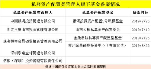 目前,首批三家私募资产配置类管理人已经完成了4只资产配置基金的备案,分别是山南云栖私募资产配置基金、金晟启航私募资产配置型基金、银河投资资产配置1号私募基金和苏州金晟硕乾投资中心(有限合伙),其中金晟硕业投资备案了2只基金,山南投资、银河投资各备案了1只基金。