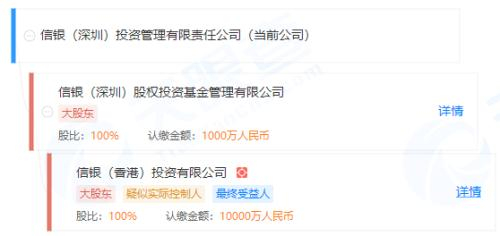 我们来看看这家新的私募资产配置管理人的股东背景。天眼查信息显示,公司的大股东是信银(深圳)股权投资基金管理有限公司,穿透实际控制人是信银(香港)投资有限公司。