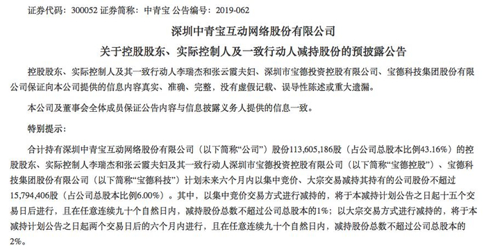 9月27日晚间,中青宝发布公告称,公司实际控制人李瑞杰和张云霞夫妇及其一致行动人宝德控股、宝德科技计划未来六个月内以集中竞价、大宗交易减持其持有的公司股份不超过1579.44万股,占总股本的6.00%。