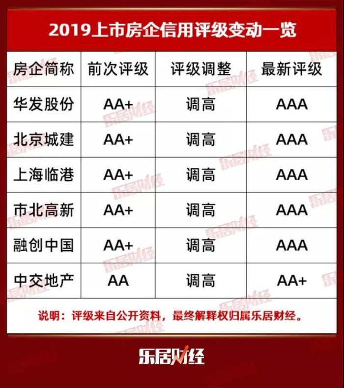 6家主体信用评级上调的房企分别是华发股份、北京城建、上海临港、市北高新、融创中国、中交地产,前5家从AA+上调至AAA,中交地产从AA上调至AA+。