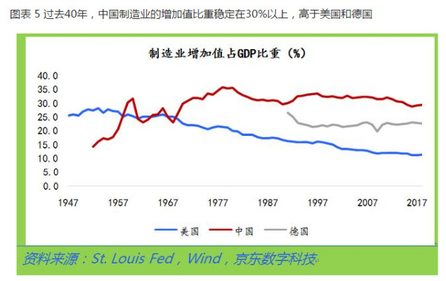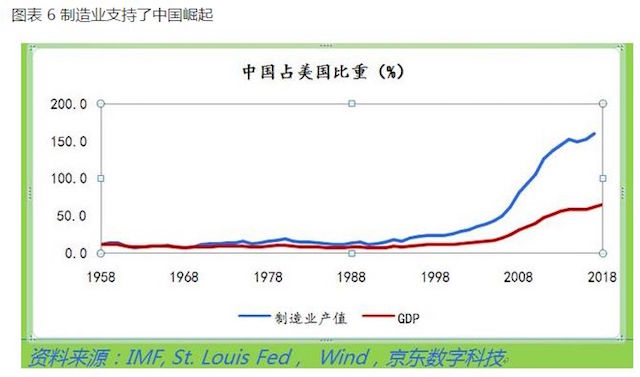 在1950年,美国制造业产值占全世界的比例高达40%。而到2018年,美国工业产值为2.97万亿美元,其中制造业产值为2.33万亿美元,占其GDP的比重仅为11.4%,而中国2018年工业产值达到了5.53万亿美元,其中制造业产值达到了4万亿美元,占GDP总量的比重为29.4%。中国的制造业产值是美国的1.7倍。中国已经建立了完整的工业体系和制造业产业链,中国制造和世界工厂,已经成为中国经济的标签。