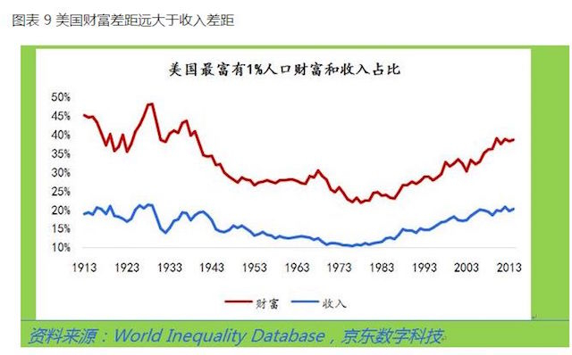 贫富差距的扩大不仅体现在工资性收入,更重要的是财富差距。对冲基金公司桥水创始人瑞·达利欧(Ray Dalio)在全球经济周期研究报告中,也多次讨论到美国制造业工作的流失和财富差距的急剧增大。当前美国的贫富差距已经接近大萧条前夕的1930年,直奔马克吐温和菲茨杰拉德笔下的镀金时代,而镀金时代美国贫富差距的巅峰期,1%的富人拥有接近90%的财富。