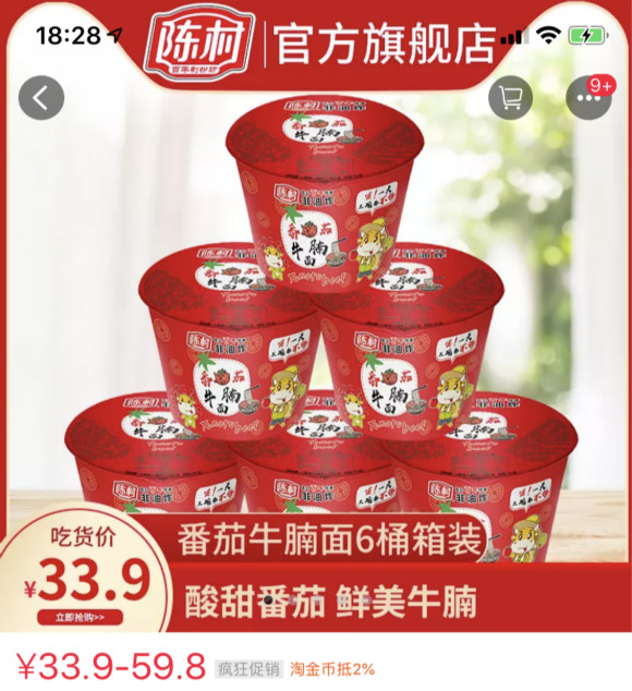 从销量看,方便面并非陈村目前的主力产品,其天猫旗舰店目前有粉丝10.2万,销量排在第一位的是云南过桥米线,月销量在2493笔,其次是河粉和重庆酸辣粉(均超过1300笔),番茄牛腩面的月销量仅有20笔。