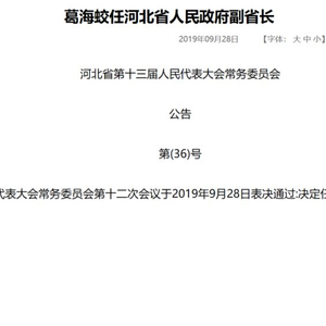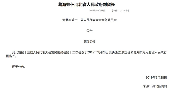 河北省政府网站28日公告称,河北省第十三届人民代表大会常务委员会第十二次会议于2019年9月28日表决通过:决定任命葛海蛟为河北省人民政府副省长。这距离他上任光大银行行长一职尚不足一年。