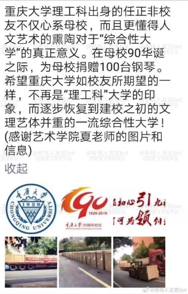 而通过任正非向母校捐赠钢琴的新闻,每经小编梳理背后的资料才知道,华为、任正非与重庆大学的关系,原来这么密切。