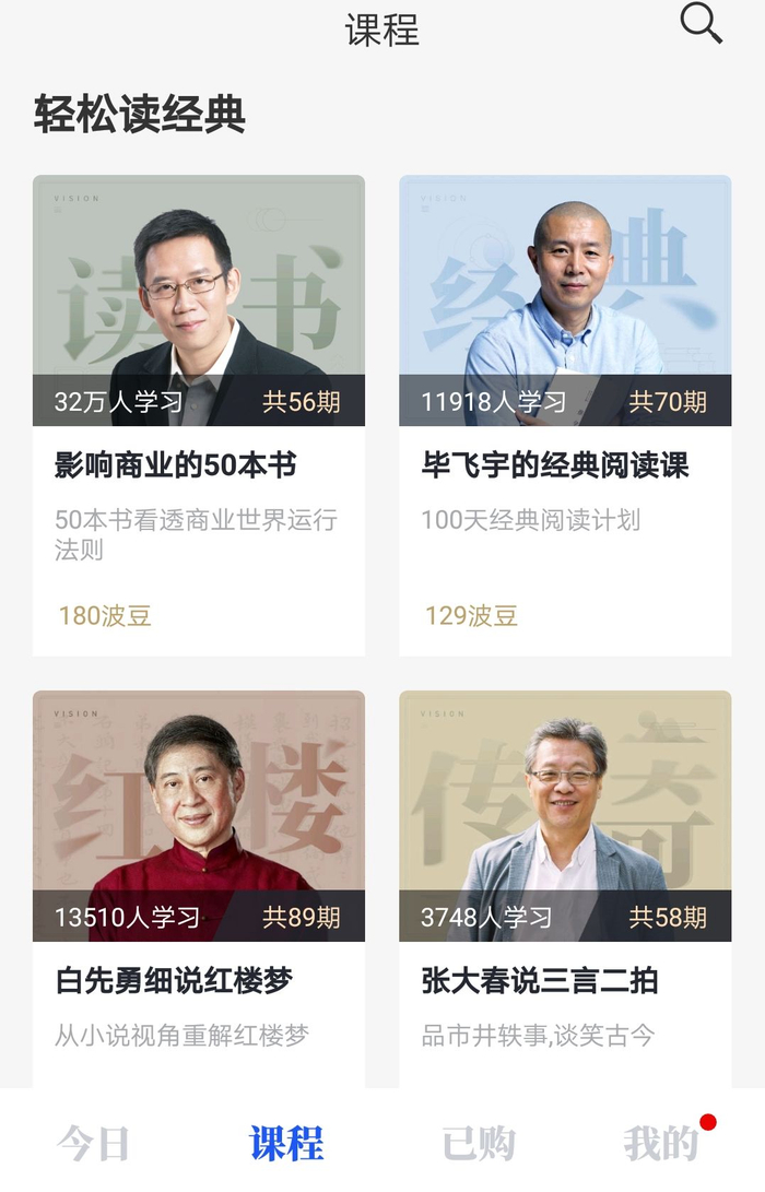 以App课程一栏中轻松读经典为例,吴晓波的《影响商业的50本书》累计学习人数为32万,而毕飞宇的《经典阅读课》和白先勇的《细说红楼梦》分别只有一万多人学习。