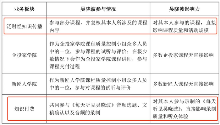 而在新匠人学院和企投家学院业务中,吴晓波基本上只承担着品控的角色,在课程上线前,参与试听与评价,极少数情况会会作为企投家学院课程讲师,参与课程交付过程。