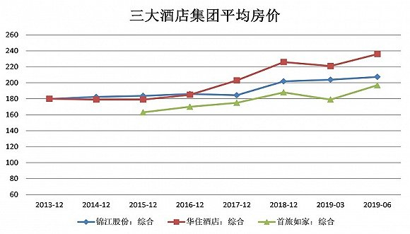 除此之外,酒店客房单价在过去几年中也处于上升趋势。截止2019年6月末,华住、锦江和首旅的单房平均房价分别为236、207和197元,同比分别上升4.4、2.5和4.8个百分点。平均房价上升和中端酒店占比提升有很大关系。例如,锦江酒店2019年中报中端酒店占比为37.1%,上年同期则为28.2%。华住的平均房价大幅高于锦江和首旅也是因为其中端酒店占比更高。