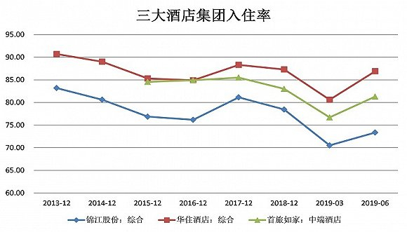 酒店景气度骤降直接体现在入住率下滑。华住、锦江和首旅如家2018年的平均入住率分别同比下降1.0、2.7和2.5个百分点。2019年的二季度数据略有回升,但主要是季节性因素的影响。从景气度数据预测,今年入住率恐怕也不太乐观。