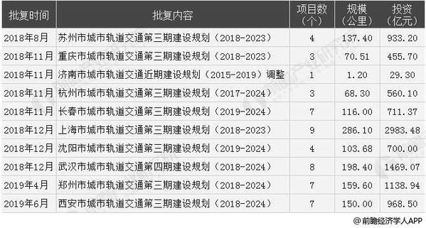 城市轨道交通发展获重视,主要原因之一是客运量庞大。2018年上半年没有城市获得批复,8座城市的轨道交通建设规划全部于下半年度获得国家发改委批复,批复总规模981.59公里,项目39个,总投资7842.22亿元。2019年1-6月,中国内地仅《郑州市城市轨道交通第三期建设规划(2018-2024)》和《西安市城市轨道交通第三期建设规划(2018-2024)》获得国家发改委批复,批复规模309.6公里,项目14个。