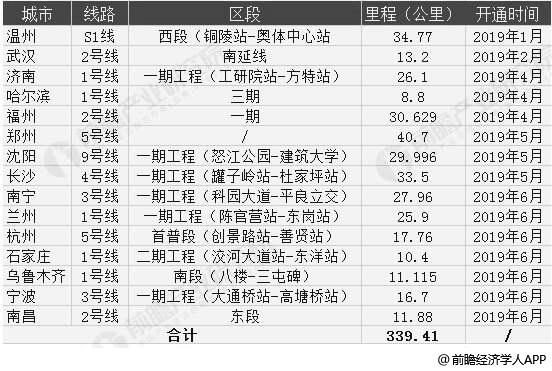 2019年上半年度,中国内地共有15座城市发布新线开通公告,分别为石家庄、武汉、南宁、宁波、哈尔滨、郑州、长沙、杭州、南昌、福州、沈阳、济南、乌鲁木齐、兰州和温州,新增运营里程339.41公里,新增车站238座。