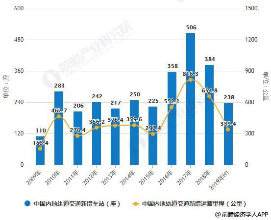 2009-2019年H1中国内地轨道交通新增车站及运营里程统计情况